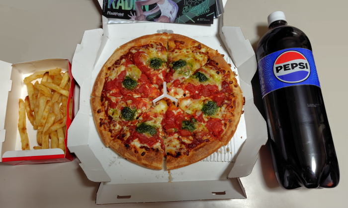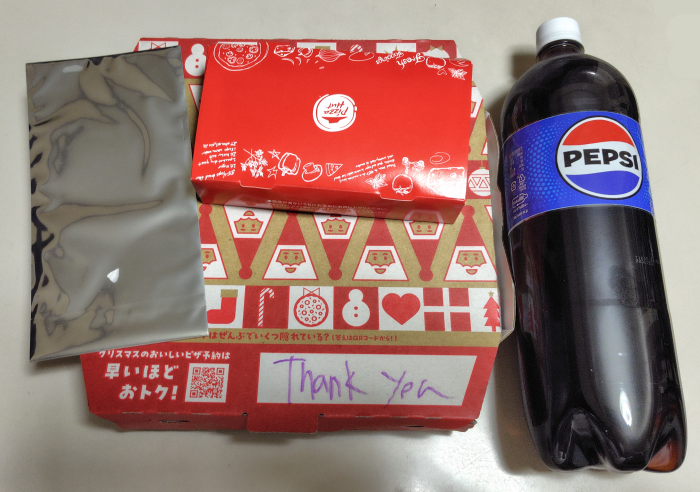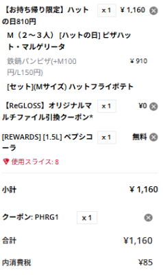 1,000円以上でキャンペーン参加なので、マルゲリータピザを鉄鍋パンピザにしつつ安くなったハットフライポテト追加しつつ、リワードでペプシを頼んでみました。