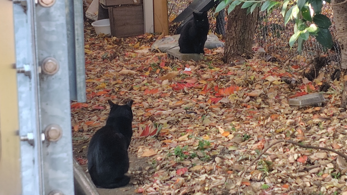 ブランチ横浜南部市場の猫ちゃんスポットに寄った日に珍しく黒猫ちゃんが二匹いるのを見つけました。冬毛だからか黒毛がもこもこしててテカテカしてて可愛いですね。手前の黒猫ちゃんは当初足元にいたらしく近づいてトタトタ奥に逃げて、ビックリして驚かされちゃいましたね。