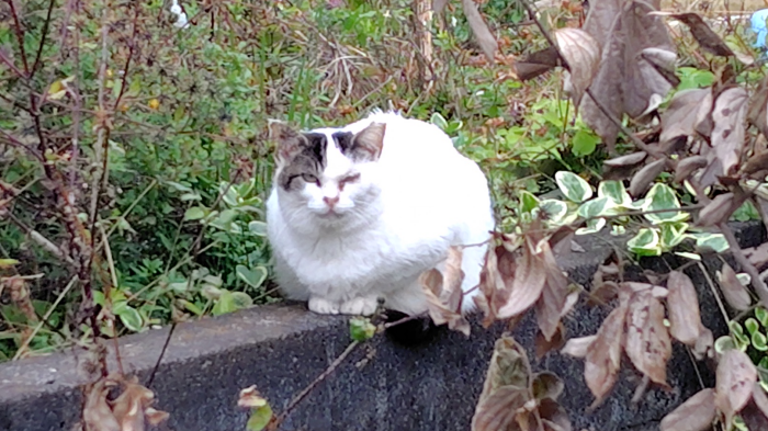 隣町へ行く途中によく見かける猫ちゃんがブロック塀の上にちょこんと座ってますね。冬だからか毛がもこもこと膨れており冬毛もこもこですね。拡大してみたら片目が痛そうですね。前足がちょこんと見えており可愛さアップですね。