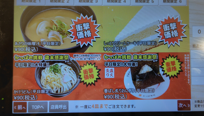 早速タッチパネルを確認すると平日限定大特価商品を確認できました。今回はうどんとおにぎりに加えて、あさりの味噌汁にしっとりクリームケーキが82円(税別)商品にラインナップされました。早速ケーキ以外を頼んでみました。