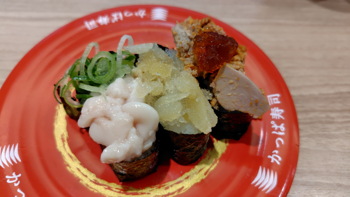 続いては3種の冬ネタ軍艦三昧を頼んでみました。白子軍艦、数の子刻み軍艦、あん肝軍艦 ポン酢ジュレのセットですね。前回来た際に頼もうと思ったけど優待カード忘れたので今回にまわしてました。白子軍艦はトロっと濃厚で、数の子はプチプチとした食感を楽しみ、あん肝軍艦はしっとりとした濃厚さを堪能できるのに290円とお安い有難いセットでした。