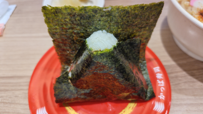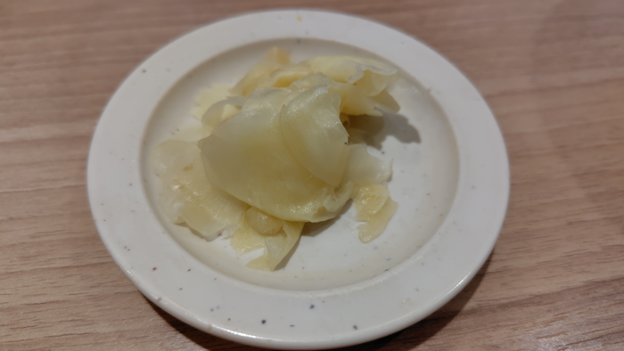 おにぎりと一緒にいつものガリが届きました。店内は混んでいるけどちゃんと汁気は切られて盛り付けられているので、厨房は余力があるのかな?お口の中リセットには丁度いいのでガリは有難いですね。