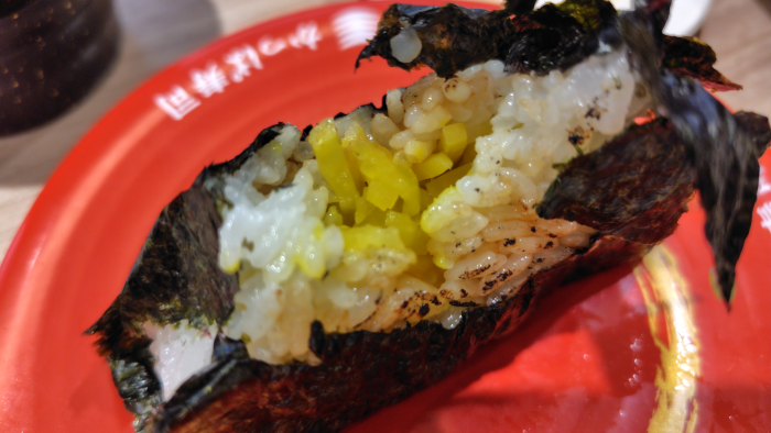 続いて届いたのがおにぎりですね。前回のおにぎりと違って背後の海苔がピーンと立っててかっこいいですね。ピーンと立ってようと立ってなかろうと味はそこまで違わないとは思うんですけどね。食べてみると炙られた香ばしさと塗られた醤油の塩気にコリコリの細切り沢庵のアクセントがあり満足の一品でした。
