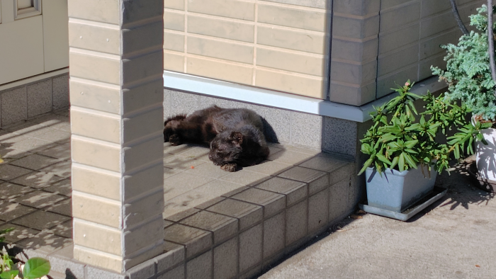 横浜駅の方に行く途中で見かけた黒猫ちゃん。民家の玄関みたいなところがに当たり良くて暖かいからか寝ていました。暖かいからか動きたくない感じであまり警戒せずスヤスヤ寝ていて可愛いですね。以前は置いてある塵取りの上にちょこんと座ってて可愛かったです。