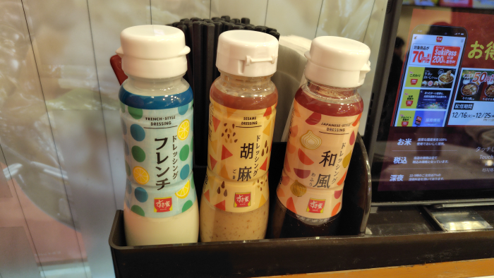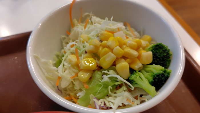 ついてくるサラダですがコーンとブロッコリーと千切りキャベツとかがありますね。ドレッシングはフレンチと胡麻と和風の3種類あって選び放題ですね。今回は半分にフレンチをもう半分に胡麻をかけてみました。