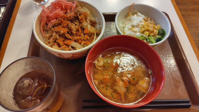 牛丼並には七味と紅ショウガをのせてみました。とん汁にも七味をかけて食べる準備完了です。