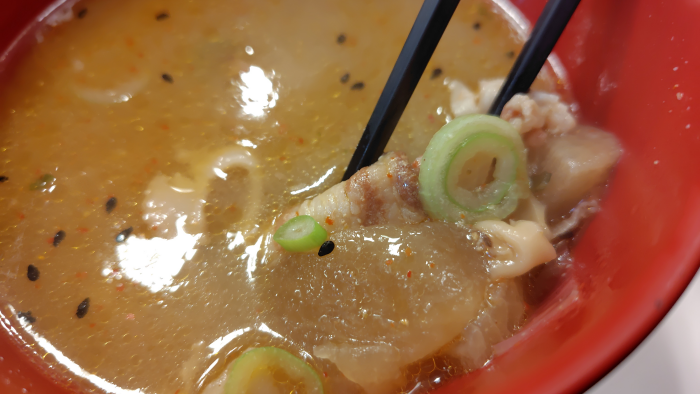 とん汁は豚肉に大根や里芋とか野菜が豪勢に入っていて大満足ですね。先日飲んだ味噌汁より脂とかの濃厚さがアップしてていいですね。あとここの店舗の七味の方が辛みを感じたのは何でだろう?