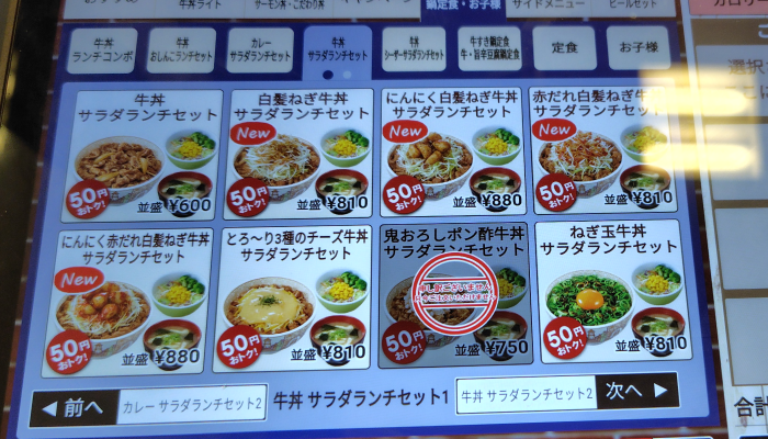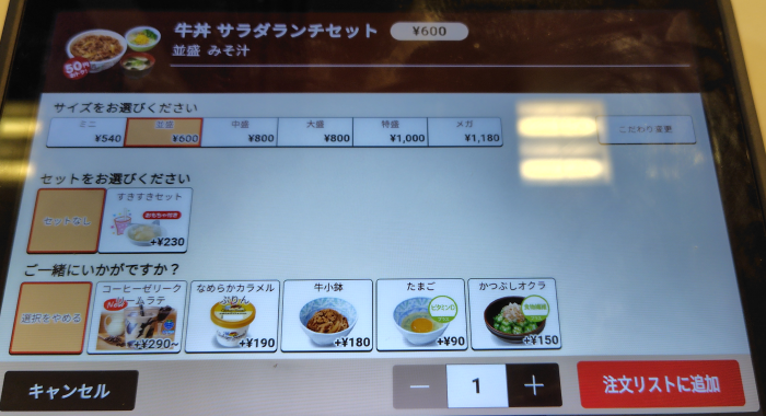 早速注文してみようと注文パネルを確認するも、サラダランチセットはあるけど豚汁が見当たりませんね。仕方ないので牛丼サラダランチセットにしようかタップしてみました。