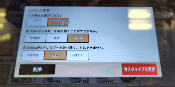 もしかしたら、この画面で豚汁を選べられるかと思ったら無いですね。仕方ないのでつゆだくで頼もうと思うのでこだわり変更をタップしました。
