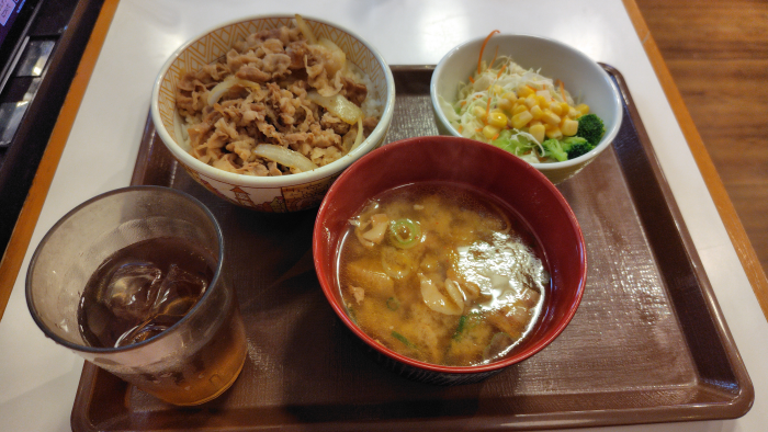 牛丼並のとん汁ランチランチセットだったので700円でした。500円分の優待券に楽天ペイの期間限定ポイント払いでノー現金でフィニッシュする事ができました。やったぜ!