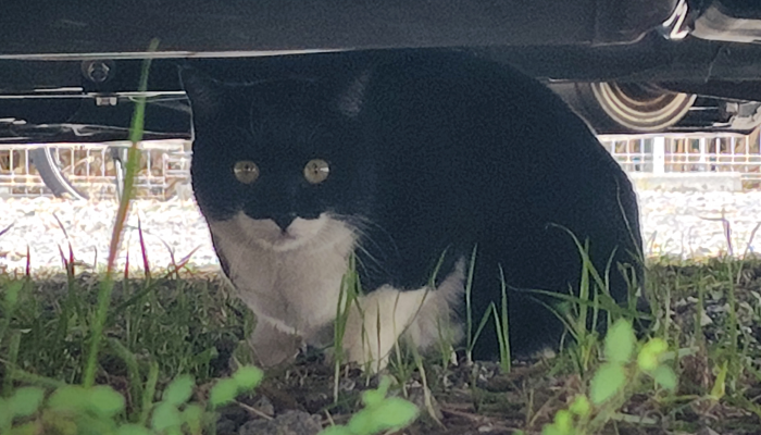 トコトコ歩いていたら猫を見つけたので寄って行ったら車の下に逃げ込まれました。スマホでパシャパシャ撮ってみたけど、凄いビックリした顔で目をまん丸くしてビックリしてて可愛いですね。何だか肉付きが良くてまん丸としてますね。