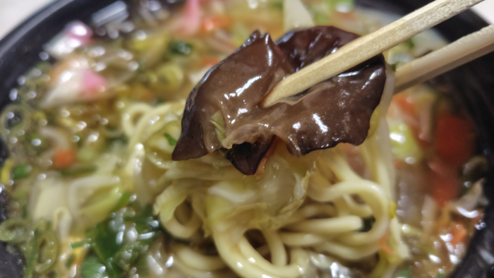 きくらげが入っておりあんかけのとろみときくらげのコリコリ感がマッチしてていいですね。それに案外生き残ってた九条ネギのシャキシャキ感もいい感じで会っていますね。