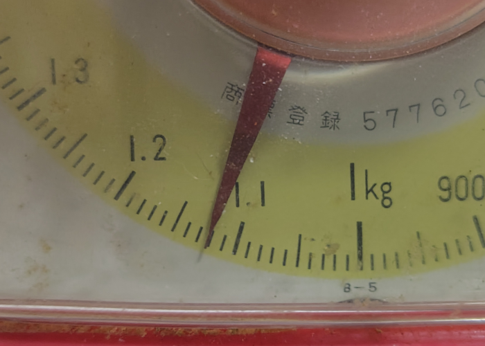 持ち帰るときにずっしり重いなぁと思って計量してみたら、1.1kg超えてますね。そりゃ重いわけですね。それを今から食べるわけですね。