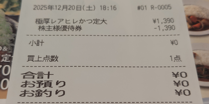 株主優待を使用したのでノー現金でフィニッシュする事ができました。こんないい商品を食べさせてくれて、松屋フーズの株主優待は有難いですね。