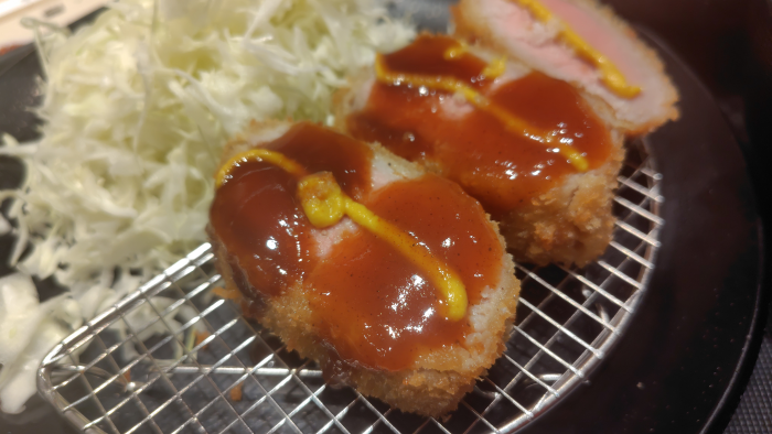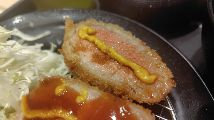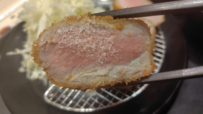 レアヒレかつって事で凄く真ん中がピンクですね。ちょっと心配になるけど、ちゃんと火の通ったピンク色って感じで安心かな?