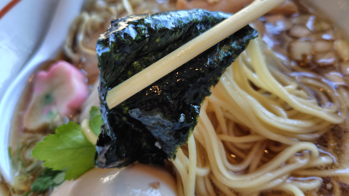 富津産特上海苔らしいですが、見た目はちょっと黒のテカリが強い海苔にしか見えません。食べてみると濃厚な海の風味を感じられたので特上な感じで麺と一緒に食べるといいですね。