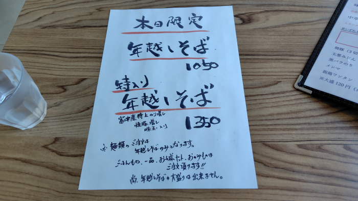 ラーメンメニューが年越しそばと特入り年越しそばの二品のみとすがすがしいラインナップですね。大晦日だし品数絞ってやってる為の結果なのかな?