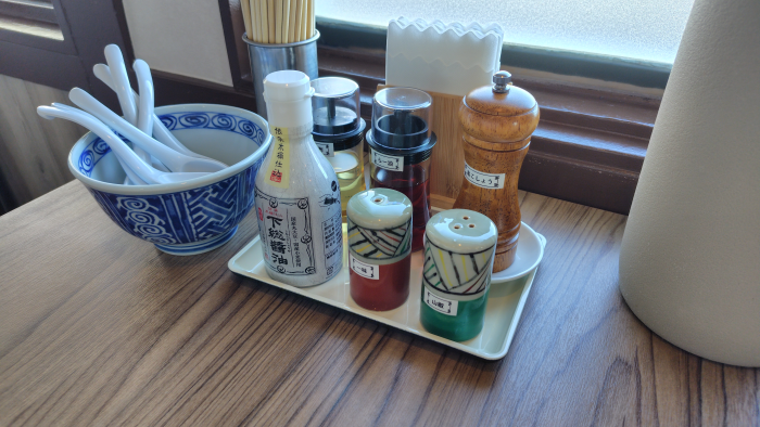 卓上調味料は昆布酢、ラー油、胡椒、下総醤油、一味、山椒とラインナップは多いですね。お酢も普通のお酢でなく、昆布酢ってのが用意されてて他においてあるところ見たことないので驚きですね。