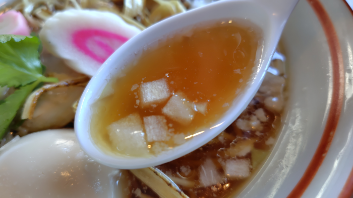 スープは澄んだ醤油っぽい色ですが、何やらにぼしっぽい味わいと脂のドカンとするパンチ力が合わさって新鮮なおいしさでした。いつも二郎系食べるのが多いから上品に感じるね。それと玉ねぎのみじん切りがしゃくしゃくといいアクセントになります。