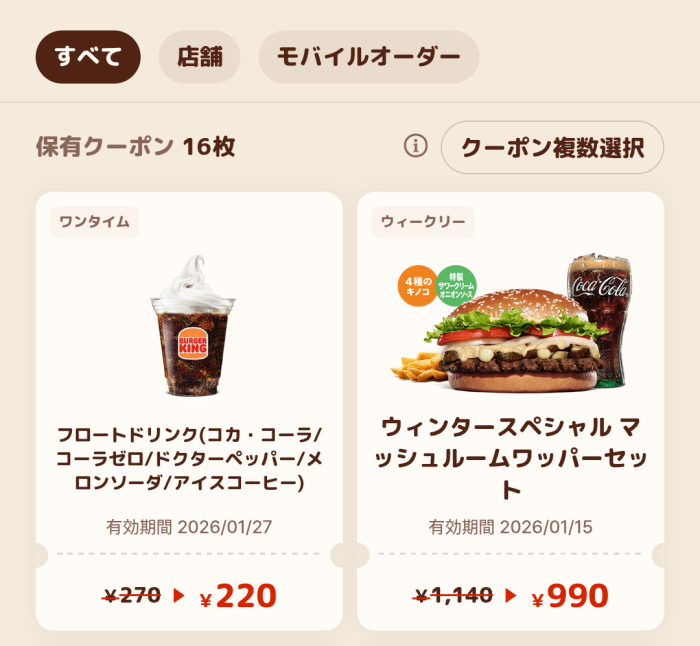 ウィンタースペシャルマッシュルームワッパーセットが990円となっており、バーガーキングアプリのランキングを維持するのに丁度いい金額だったので食べに行くことにしました。