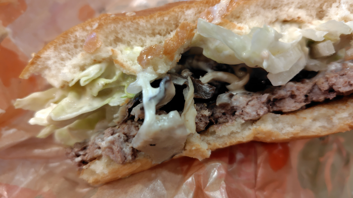 食べてみるとシャキシャキのレタスにトマトのジューシー感と肉の濃厚な味わいに混じって、くにゅくにゅするのがあるのでキノコがこれかな?いつものワッパーにちょっと味わいが深くなってる感じでキノコが良い味の追加になってますね。