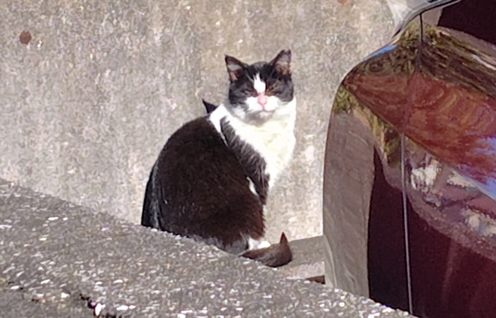 ハチワレちゃんを見つけたけど、逃げられて赤い車の奥に逃げ込まれちゃいました。鬱陶しそうにこちらを見てて可愛いね。まぶしいのか目を細めて睨んでる感じで可愛いね。お花がピンクでそれも可愛い。