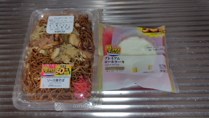 早めに売り出された焼きそばとプレミアムロールケーキを食す