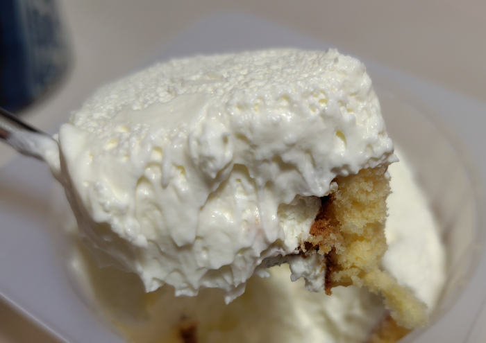 袋から出してみると前回と違って生クリームがギッシリと充填されてて、上から見てスポンジケーキが見えないですね。前回まで上から見てスポンジケーキが見えたのでがっかりでしたが今回は本気を出してきた感じですね。生クリームもしっとりとしててレンチンして熱々の麦茶に合わせたけど良かったですね。これなら期間中にもう一回買ってもいいかな?