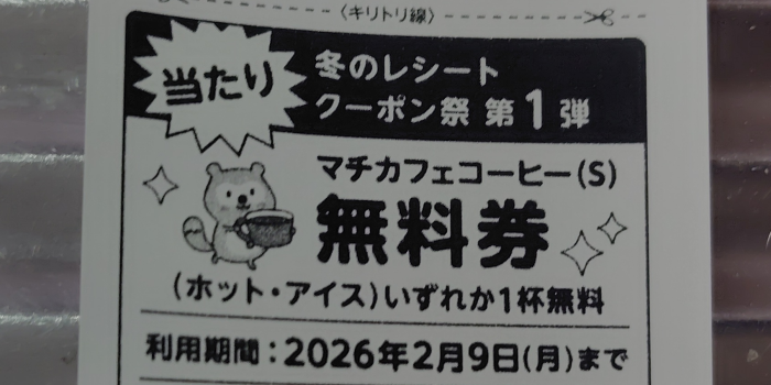 やたら長いレシートくれたと思ったけどよく見たらマチカフェコーヒーSサイズ無料券が付いてました。知らずに貰えたのでラッキーでした。これとプレミアムロールケーキ合わせて今度おやつとして食べようかな?