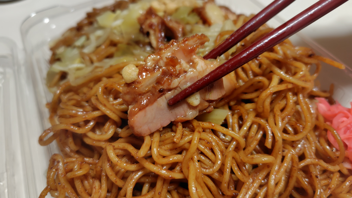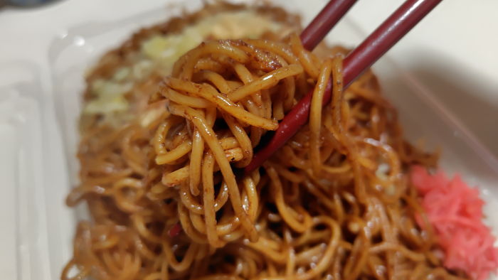 レンチンしたのでほっかほかで食べれてソースの味が濃すぎず丁度いい感じで、ちょっとパサついた感じの麺もソースがそれを埋めてくれるのでいいですね。具材も案外多くて味変感覚で食べる事ができますね。ただ、量が多すぎて3分の2くらい食べると飽き始めますね。塩分量9グラムくらいあってなかなかのヘビーな食品でした。