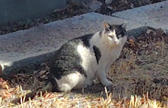 あまり見かけない猫がテコテコ歩いてるのを見つけてスマホを構えたら、猫がこちらに気が付き警戒して止まったのでチャンスとばかりに撮ってみました。何やお前?って顔で警戒しててかわいいですね。こちらが近寄れない事を確認するとテコテコ歩いて行っちゃいました。