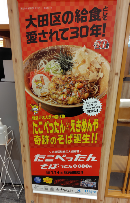 大田区のたこぺったんとえきめんやがコラボした奇跡のそばってのが売ってるみたいですね。たこぺったんは大田区の給食で名物な物らしい。これは1月29日がたこぺったんの日って事がワンコインで販売らしいですね。