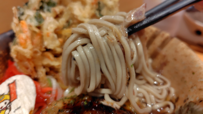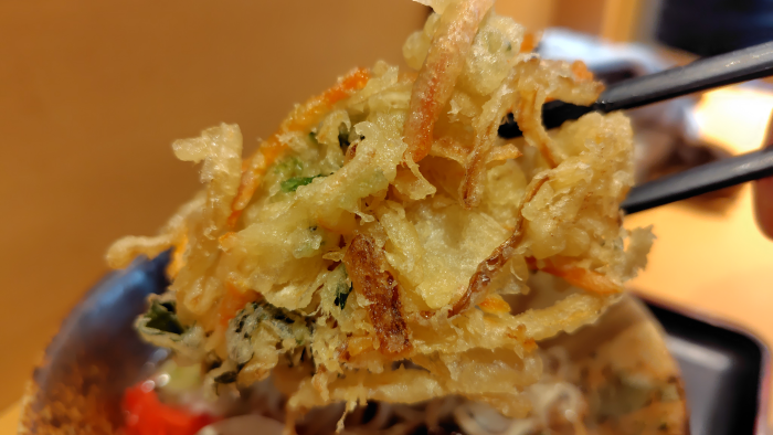野菜かき揚げを持ち上げて食べてみたら、下から刻み葱と刻み海苔が出てきたので美味しく味変で食べれました。