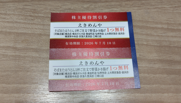 京急の株主優待割引券の中にえきめんやで使える券があり、野菜かき揚げが1つ無料って事でコレも使います。