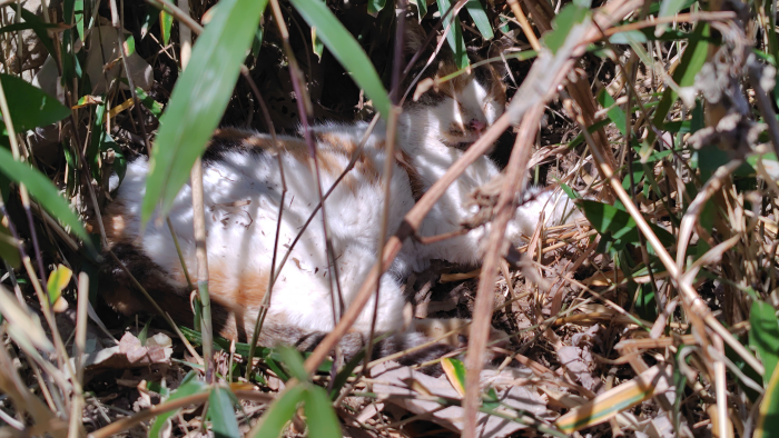 隣町に行く途中に三毛ちゃんがいつも通り草むらでスヤスヤと寝ている姿を見つけました。近寄って写真撮ってもスヤスヤ寝てて可愛いですね。熟睡してるので邪魔しちゃ悪いので撤収しました。もしかして、寝たふりしてたら自分がすぐ離れると理解して寝たふりしてる?