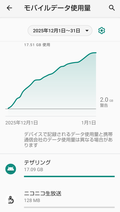12月は17ギガと限界の30ギガまで全然余裕で過ごせました。使った内容が基本的にメインスマホでの生配信見るためのテザリングだけですね。移動中の配信とかしなかったからと配信アプリの画質バグがなくなったからですかね。これなら移動中の配信見る時に画質上げてもいいかもしれませんね。