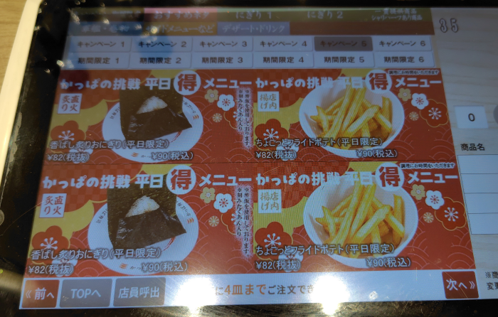 新年のかっぱの挑戦平日マル得メニューが1月13日から始まってたので、気が付いたから早速食べに来てみました。今回はおにぎりとポテトの二品だけだから注文ページは同じメニューが二個ずつ掲載されてました。