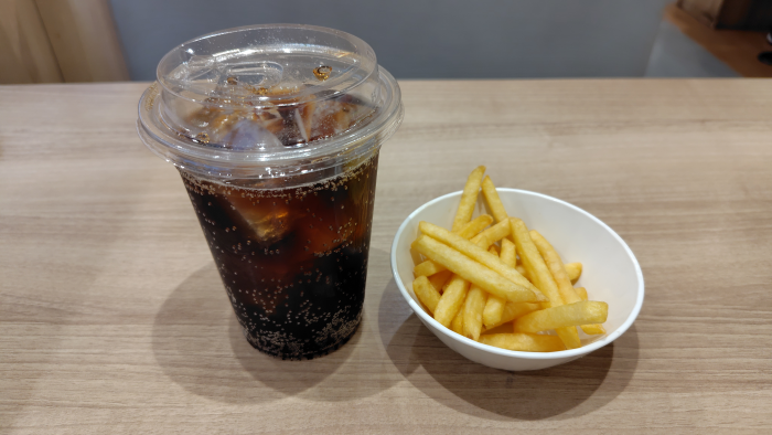 最後のデザートとして、50%割引クーポン使ってコーラLサイズと82円ポテトを頼んでみました。やはりコーラとポテトの相性は最高ですね。食べ切ったら満足できました。