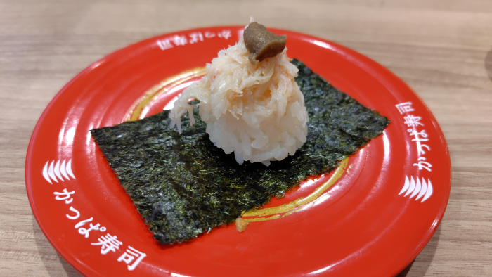 ずわい蟹ほぐし身包みってものが110円だったので、頼んでみたらカニ味噌付きでお得ですね。食べてみるとカニの味わいがカニ味噌と相まって濃厚に堪能することができました。