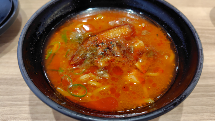 2025年12月25日からかっぱ寿司のコラボラーメンが新しくなっていて、辛くて痺れるラーメンで有名な鬼金棒が監修のカラシビ味噌らー麺(3辛)を頼んでみました。辛そうな見た目してますね。