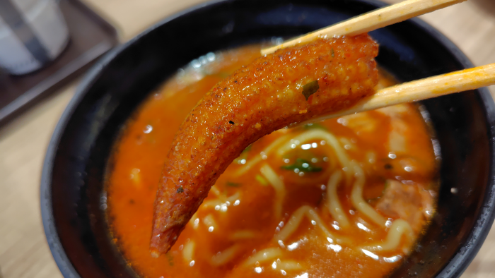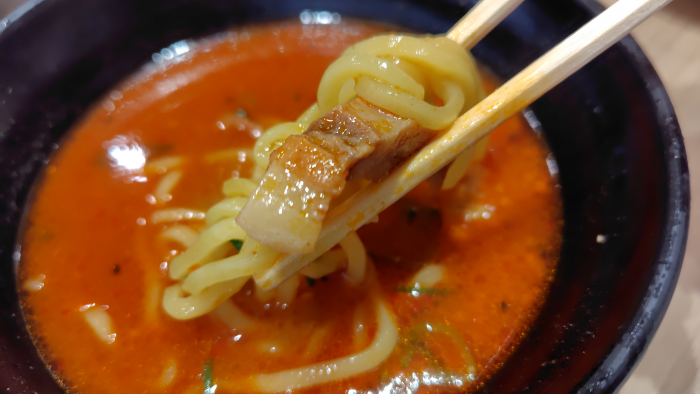 ヤングコーンは香ばしく焼かれておりピリカラ感もあってコリコリしてて美味しいですね。麺とチャーシューを一緒に食べてみたけど、肉は柔らかくてジューシーでスープも絡んでガッツリ食べてる感を味わえますね。スープはよく混ぜて飲んでみたけど、3辛か?っていうくらいちょっとピリカラであんまり辛く無かったですね。作り間違えた?