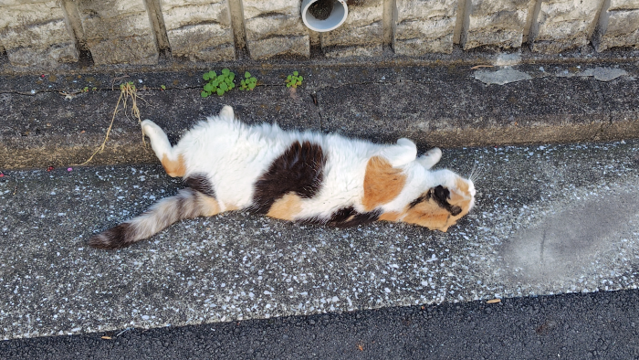 隣町に行く途中によく見かける三毛ちゃんが、この日も目があったら寄って来てくれてちょっと足にまとわりつい後にゴロンと寝転びゴロンゴロンとのたうち回ってました。ワシャワシャ撫でたり襲いかかられたりと遊んでから撤収しました。