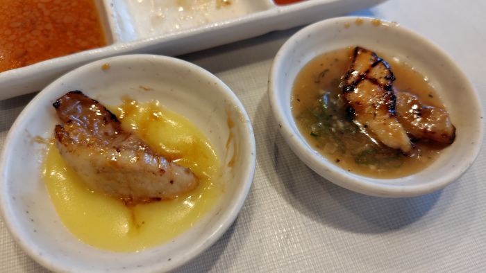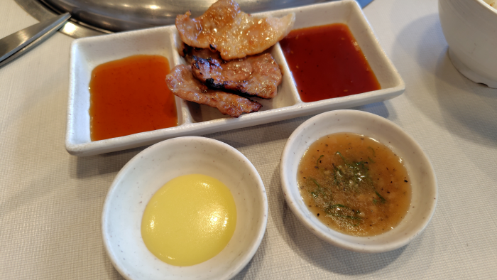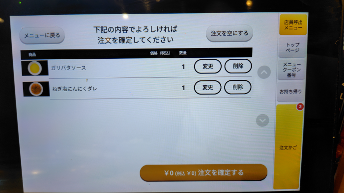 折角なので無料のソースとして、ガリバタソースとねぎ塩にんにくダレを頼んでみました。これで食べる準備が完了ですね。