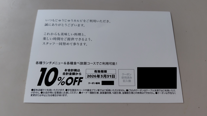お会計時にポストカード貰ったけど、切手貼る場所もないし普通にデカい割引クーポンって事ですね。これ貰って気が付いたけど、前回貰った10%引きクーポンの紙あるの思い出しました。悲しいね。