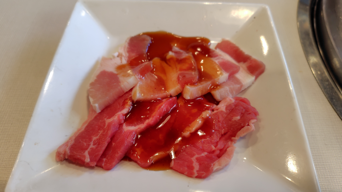 お肉は豚と牛のカルビです。各お肉が4切れずつあるので千円切ってるのにお得ですね。
