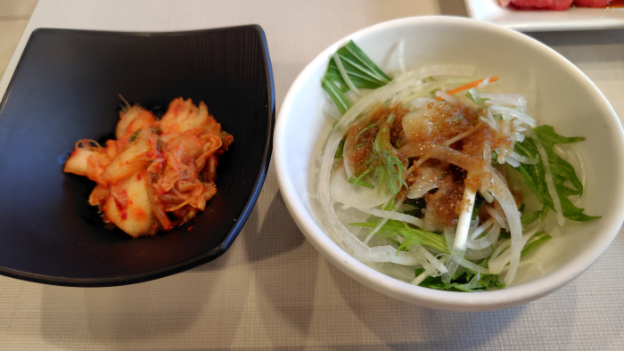 食べていたら料理が届いたのでキムチとサラダを食べてみました。キムチは酸っぱさがきつく無くてさっぱりと食べられますね。サラダはシャキシャキとフレッシュでドレッシングが味のアクセントになってて焼肉を食べる前に口の中がさっぱりしますね。