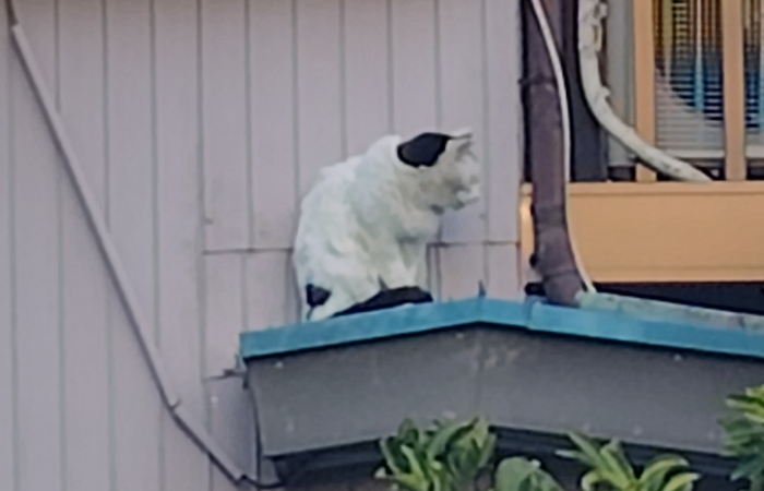 ちょっとだけある屋根の上にちょこんと座って、前足に尻尾を巻き付てる姿を見つけたのでパシャリと撮ってみました。何かに警戒してるのか覗き込んでいますね。かくれんぼでもして鬼を警戒してるのかな?何気に個々の場所に座ってる姿は初めて見たかもしれませんね。