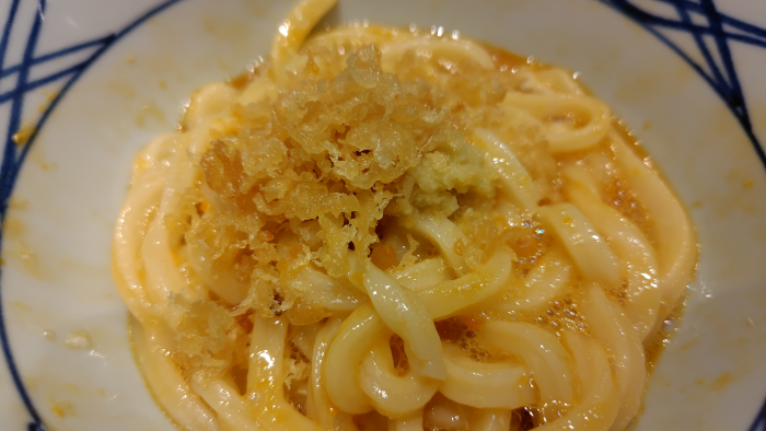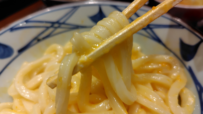 ノーマル釜玉うどんですが、黄身がまんべんなく混じって黄金色のように綺麗ですね。