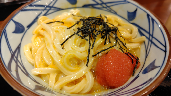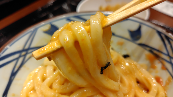 ノーマル釜玉うどんよりピンクチックになってて明太が良い感じに混じってますね。食べてみると明太のピリ辛さが付いているけど生臭さは無くて美味しくいただけましたね。