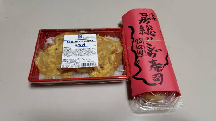 今回買ったのはかつ丼と房総のシゲ寿司こといなり寿司です。新作弁当買おうかと思ったけどダブルうな重とか高いのばっかりだったので定番商品になりました。